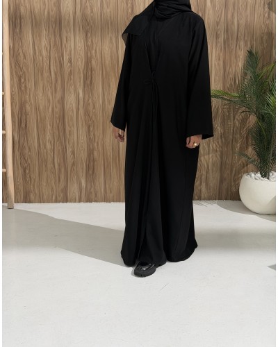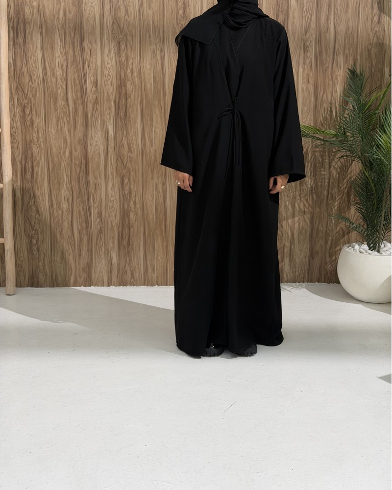 A hidden inner tie comes through a discreet side slit, allowing you to wrap and secure the abaya.