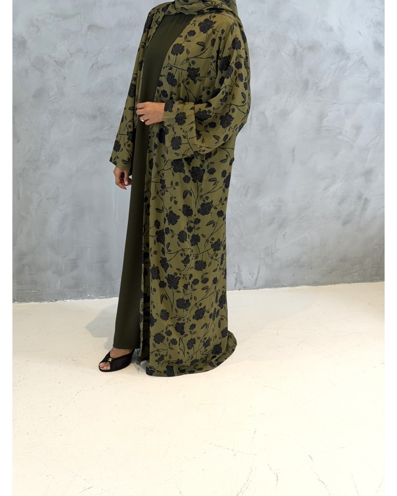 Crafted from chiffon, each abaya is fully lined with a carefully selected solid color that complements the print, ensuring opacity, fluidity, and comfort.