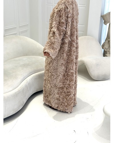 A statement abaya fully adorned with 3D floral roses, designed as a standout piece.