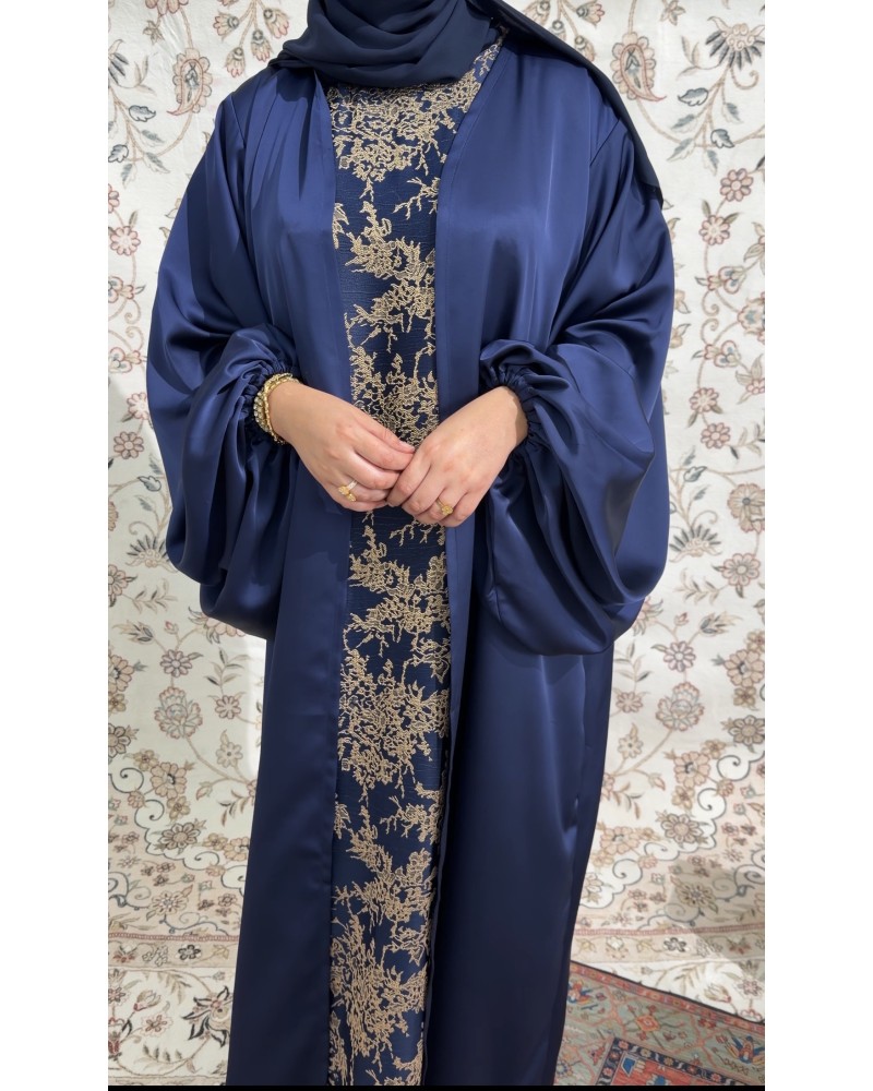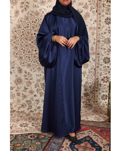 Abaya confectionnée en satin soyeux, sublimée par de manches ballons volumineuses qui apportent caractère, élégance et une signature mode affirmée.