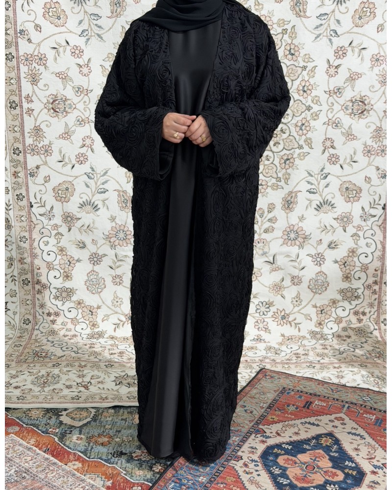 Abaya confectionnée dans un tissu texturé orné de motifs de rosaces florales, offrant un relief délicat et une présence visuelle subtile.