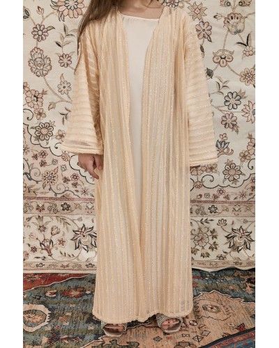 Abaya confectionnée en tulle à rayures scintillantes en lurex, apportant lumière et verticalité à la silhouette.