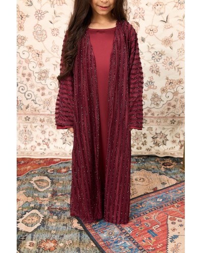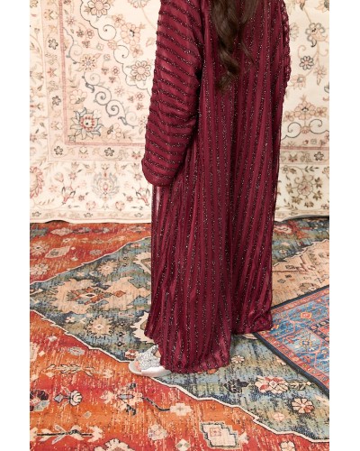Abaya confectionnée en tulle à rayures scintillantes en lurex, apportant lumière et verticalité à la silhouette.