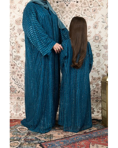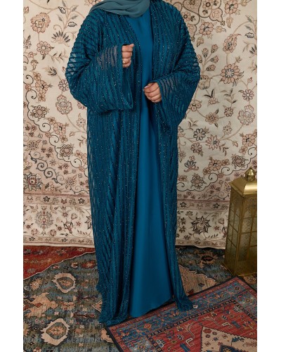 Abaya confectionnée en tulle à rayures scintillantes en lurex, apportant lumière et verticalité à la silhouette.