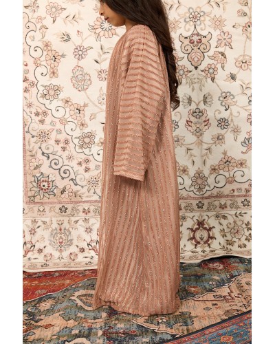 Abaya confectionnée en tulle à rayures scintillantes en lurex, apportant lumière et verticalité à la silhouette.