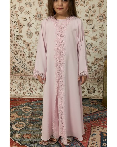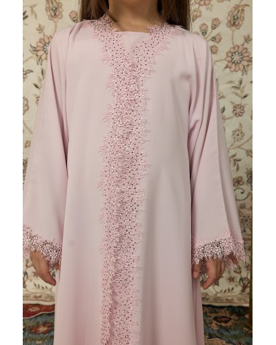 Abaya sublimée par une dentelle brodée ornée de strass, travaillée sur le devant et sur les manches, apportant éclat et raffinement à la silhouette.