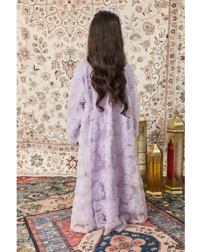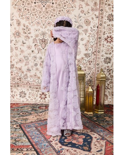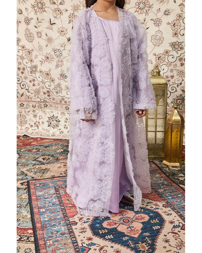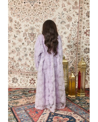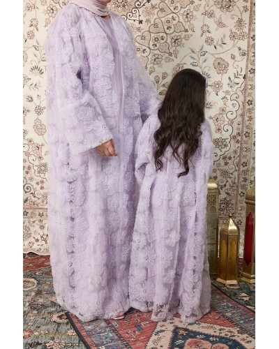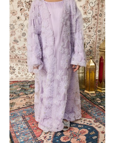 Abaya confectionnée en tulle orné de fleurs en relief perlées, offrant une texture précieuse et un rendu résolument couture.