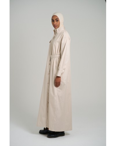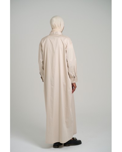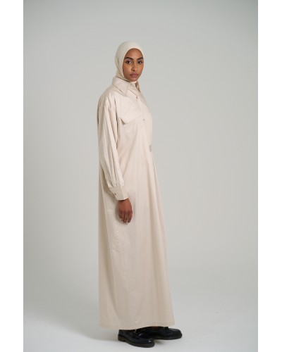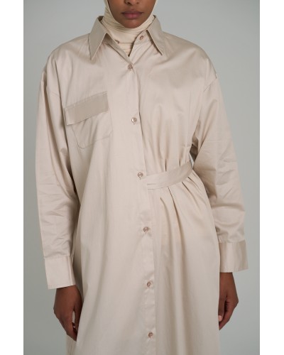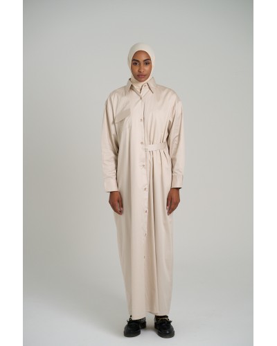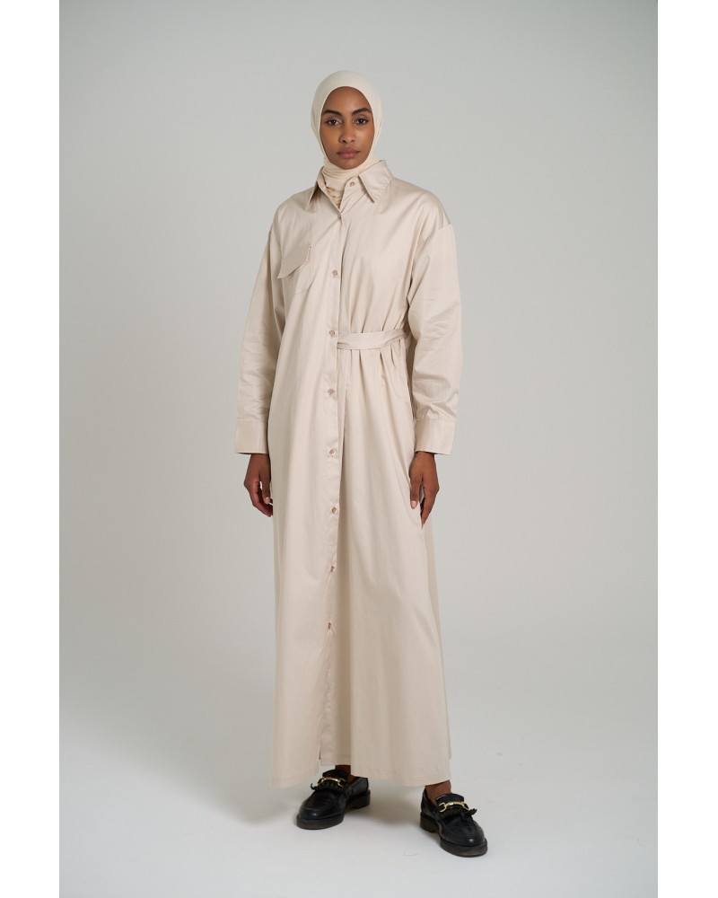 Cette robe chemise en coton organique au style minimaliste se distingue par ses détails fonctionnels et raffinés. Elle présente une poche plaquée sur la poitrine, des poches latérales pratiques et une ceinture intérieure discrète qui permet d’ajuster la silhouette tout en préservant la pureté des lignes.