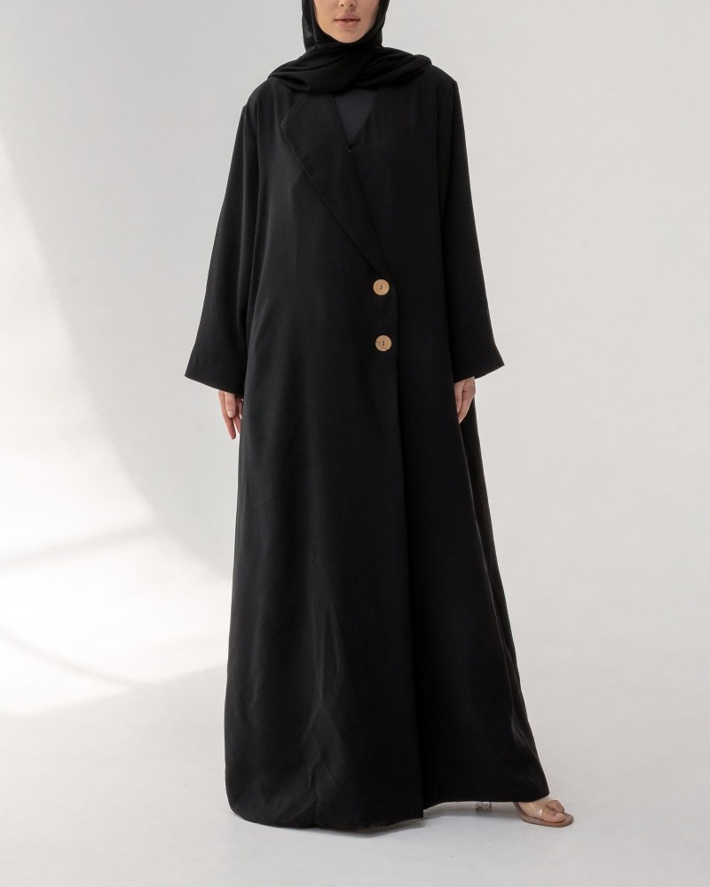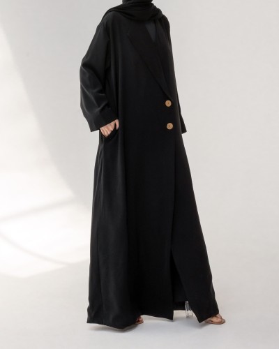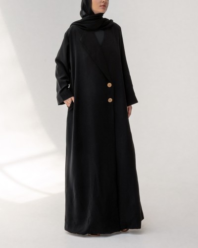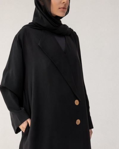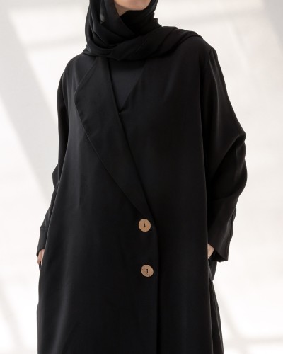 Abaya blazer au col asymétrique, sublimée par son design croisé et ses boutons effet bois. Elle dispose de deux poches latérales discrètes pour allier style et praticité.