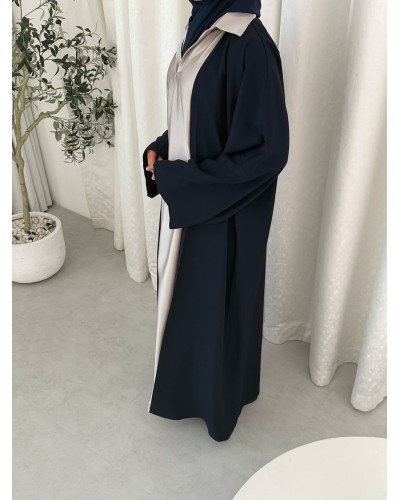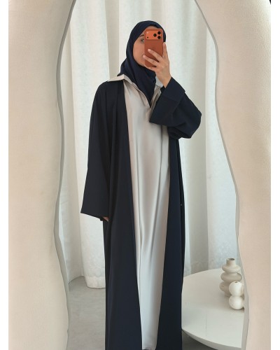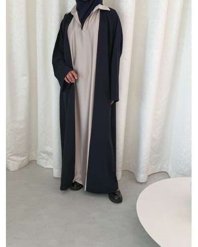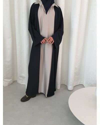 Abaya trompe-l’œil au rendu deux-pièces, donnant l’illusion d’un ensemble abaya en crêpe porté sur une sous-robe chemise en satin, alors qu’il s’agit d’une seule pièce fermée, facile à enfiler. Sa coupe fluide et son jeu de matières créent un look casual chic, idéal pour celles qui recherchent une silhouette moderne sans effort.