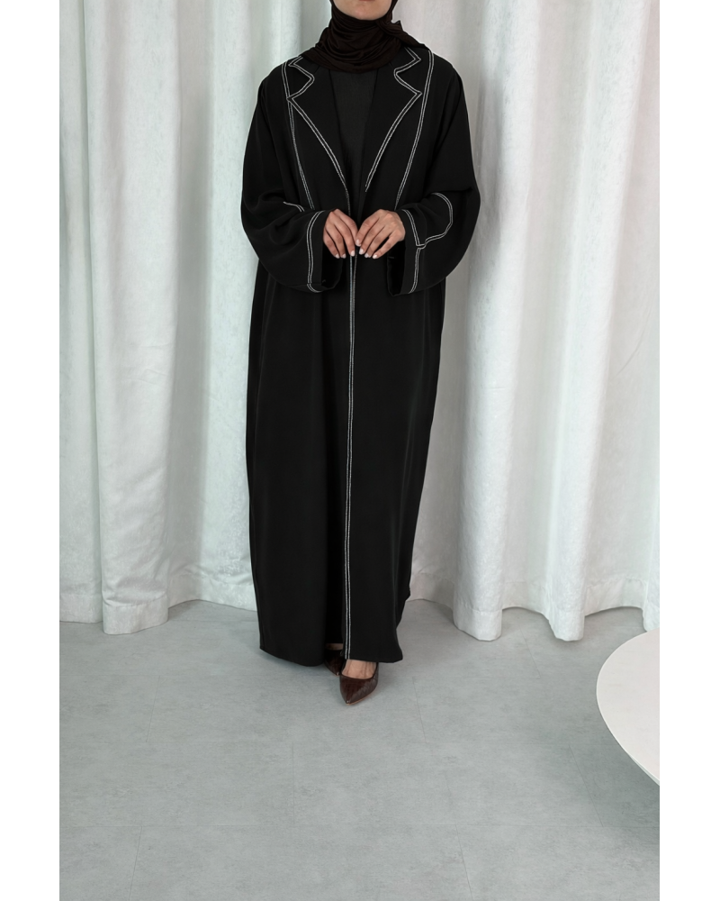 Abaya type blazer à col châle, inspirée du mythique sac Kelly avec son fermoir central iconique. Confectionnée en crêpe fluide, elle structure la silhouette tout en restant légère et confortable, pour un style ultra casual chic, élégant et résolument moderne.