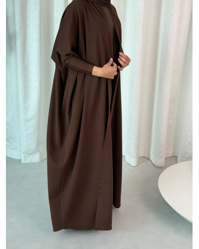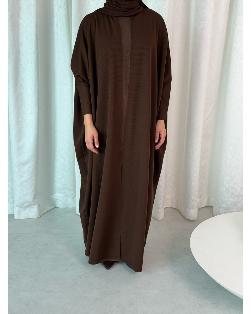 Une abaya oversize à col haut, confectionnée en jersey côtelé (ribbed jersey) pour un rendu texturé, fluide et structuré à la fois. Sa coupe ample contraste avec des manches très ajustées, créant une silhouette architecturale et élégante. Le col montant et la matière stretch renforcent l’allure moderne et sculpturale de la pièce, idéale pour un look minimaliste et affirmé.