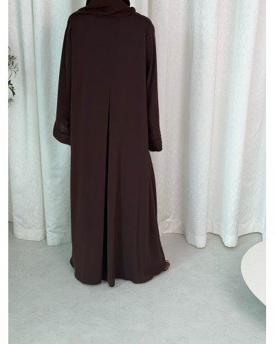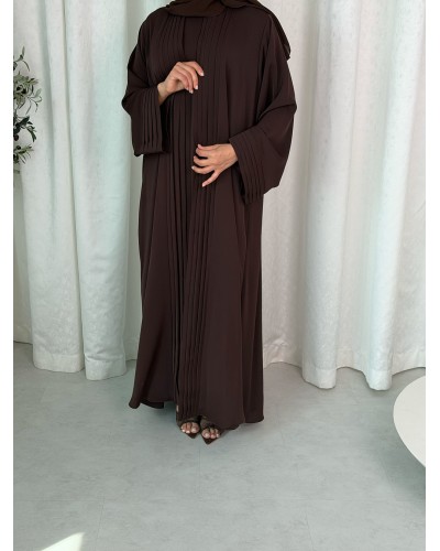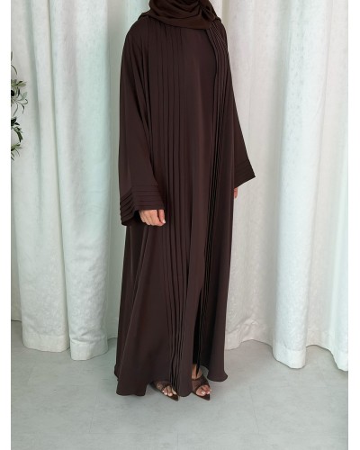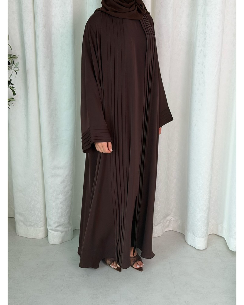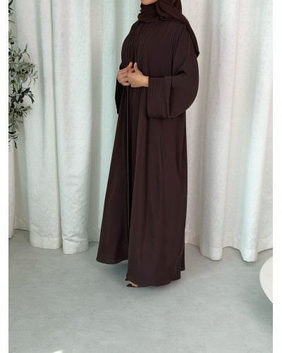 Le Sophia Set se compose d’une abaya fluide et d’une sous-robe assortie, pensées pour créer une silhouette élégante et contemporaine. L’abaya se distingue par son plissé structuré sur le devant, qui apporte du mouvement et une profondeur visuelle subtile. Les manches plissées prolongent cette ligne graphique et donnent à la pièce une allure couture, tandis que le col high-neck renforce son caractère moderne et sophistiqué. Porté avec la sous-robe, le set crée un équilibre parfait entre fluidité, structure et élégance minimaliste.