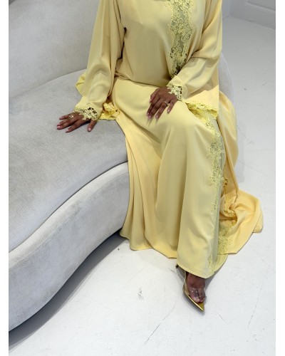 Abaya en tissu léger avec une coupe ample et des manches larges. Détail de dentelle ton sur ton positionné au centre et sur les manches, orné de strass pour apporter de la brillance et du relief.