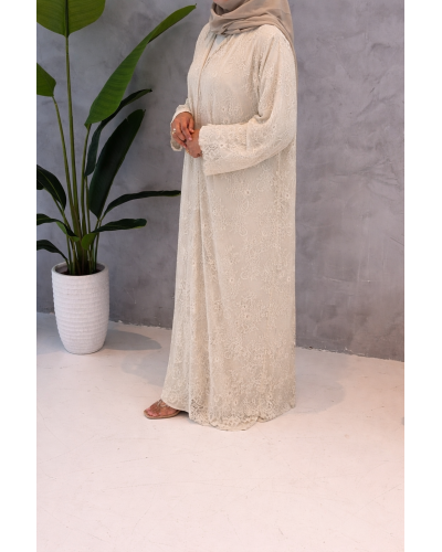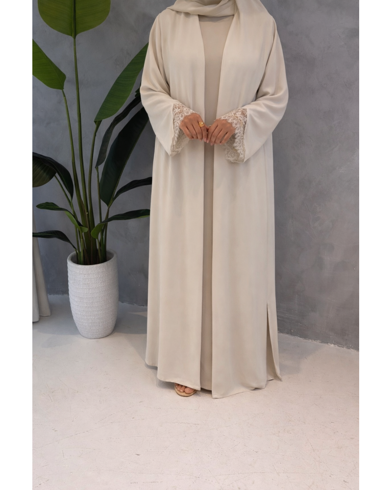 Côté 1 : une face unie minimaliste, subtilement travaillée avec des fentes au niveau des manches et du bas, laissant apparaître des touches de dentelle pour un rendu délicat et sophistiqué.
