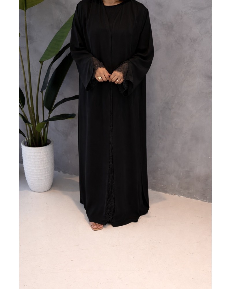 Côté 1 : une face unie minimaliste, subtilement travaillée avec des fentes au niveau des manches et du bas, laissant apparaître des touches de dentelle pour un rendu délicat et sophistiqué.